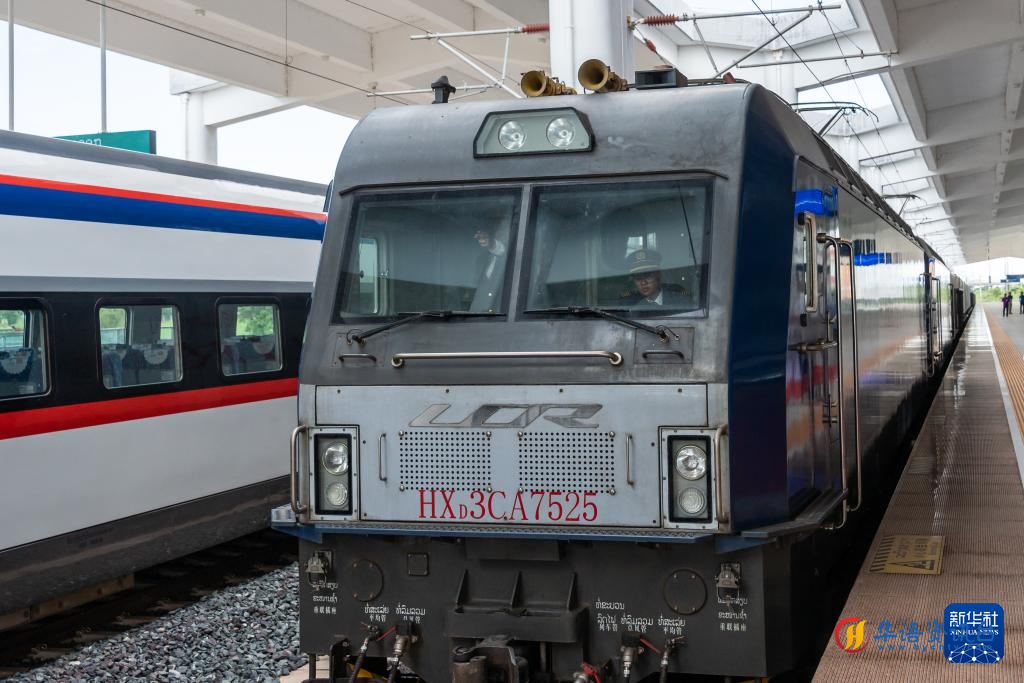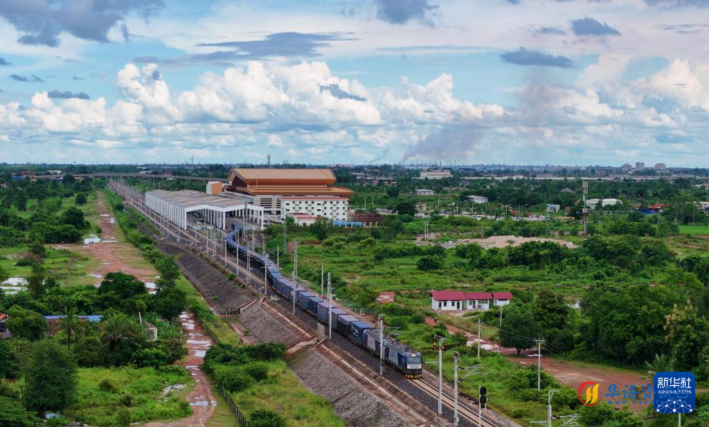 8月5日,由老挝籍火车司机独立驾驶的满载货物的列车驶出中老铁路万象站。新华社发(凯乔 摄)
