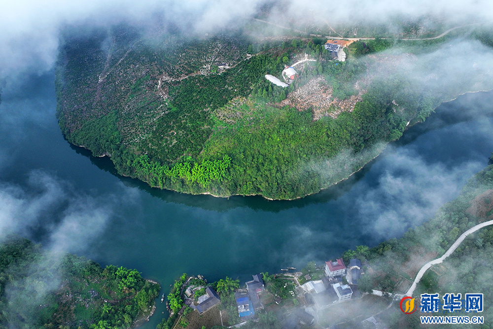 从高空俯瞰,青山绿水在晨雾笼罩下宛若一幅山水画,展现出独特的魅力。新华网发(陈碧生 摄)
