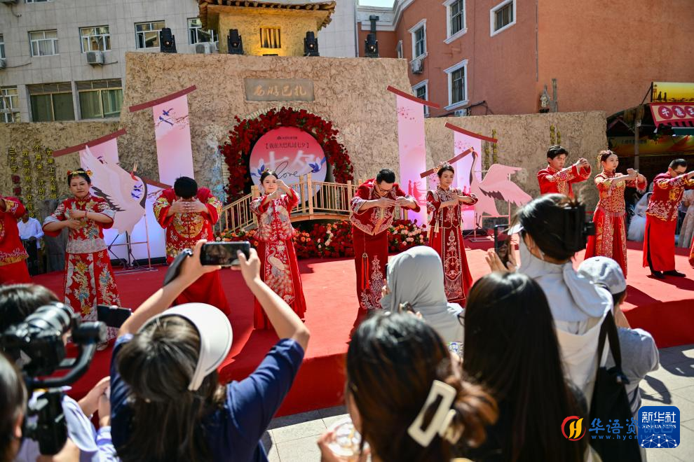 8月10日,新人参加在新疆国际大巴扎街区举行的传统中式婚礼。