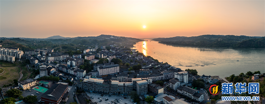 日出之际,在橘色霞光轻抚下的古镇与江面,显得格外宁静悠远。新华网发(石先彬 摄)