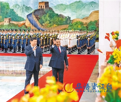 九月六日上午,国家主席习近平在北京人民大会堂同来华出席中非合作论坛北京峰会并进行国事访问的刚果(布)总统萨苏举行会谈。这是会谈前,习近平在人民大会堂北大厅为萨苏举行欢迎仪式。 |