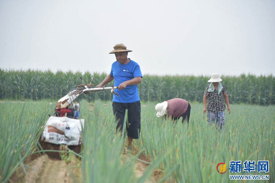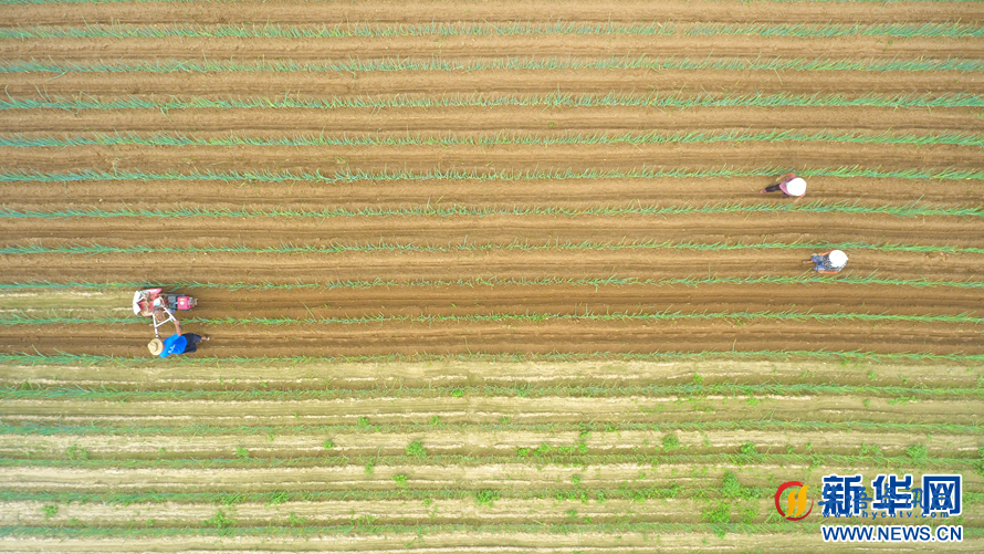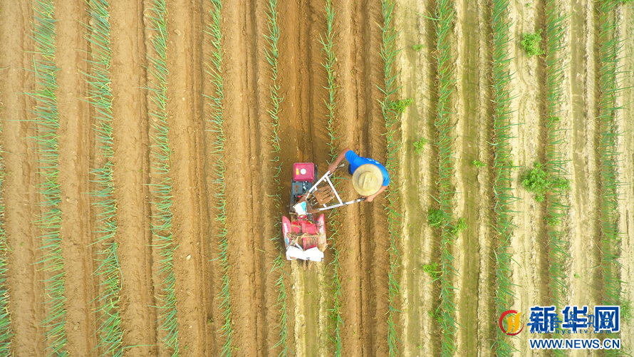 9月3日,村民在用田园管理机给大葱培土(无人机照片)。新华网发(赵玉国 摄)