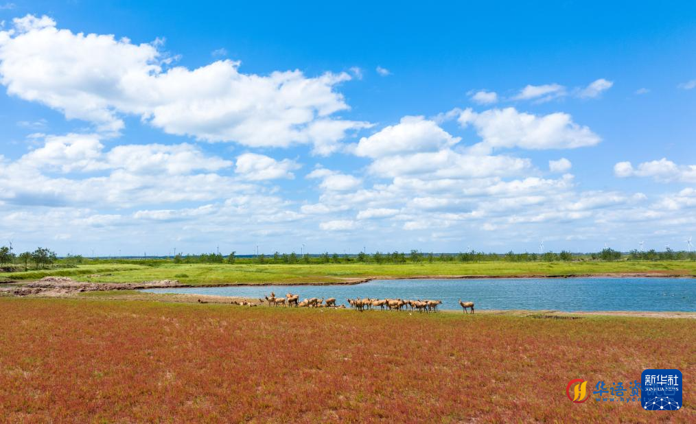 9月23日,麋鹿在江苏东台条子泥湿地觅食(无人机照片)。