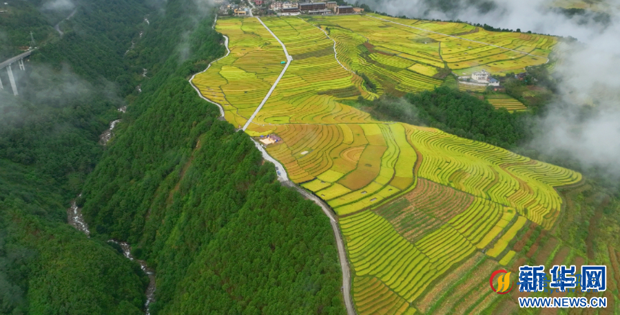 近日,云南省怒江傈僳族自治州贡山独龙族怒族自治县丙中洛镇东风村,迎来了专属秋日的动人风光。随着稻谷成熟,稻田披上金黄的衣裳,放眼望去,辽阔的大地被染成金黄,与缭绕的云雾、青翠的山峦、远处的村庄,共同构成一幅人与自然共生的和美画卷。(完)(张玛睿 徐华陵)