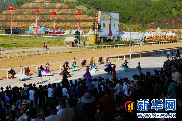 三都水族自治县西部赛马城,人们在比赛间隙观看民俗表演(10月5日摄)。