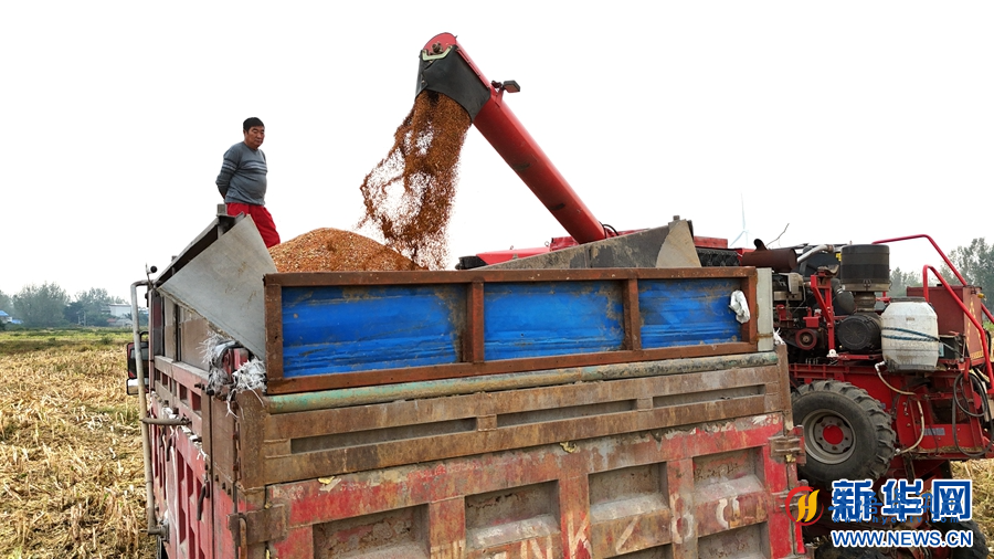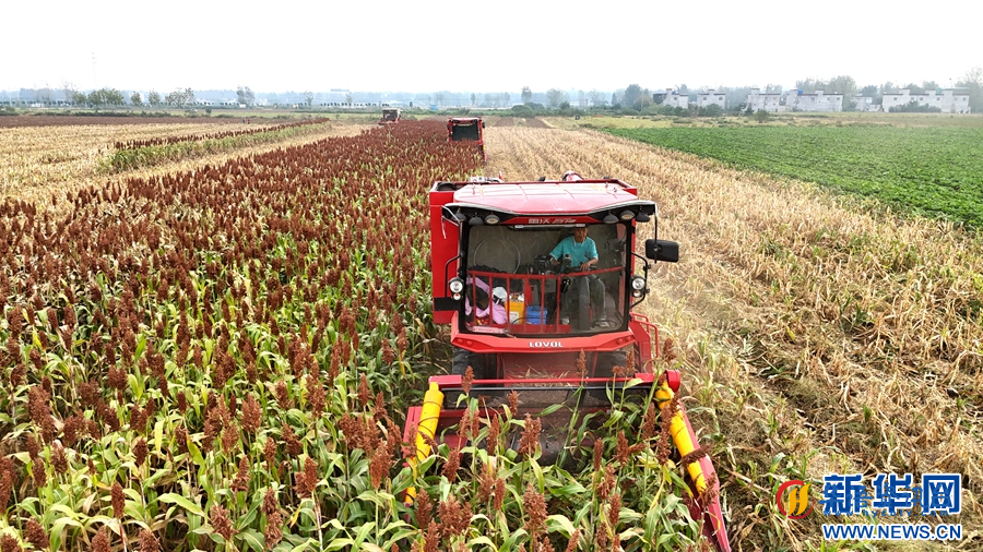 时下,河南省南阳市唐河县的高粱进入成熟收获期,当地群众抢抓晴好天气收获高粱,田间地头一派繁忙的景象。新华网发(张旭 摄)