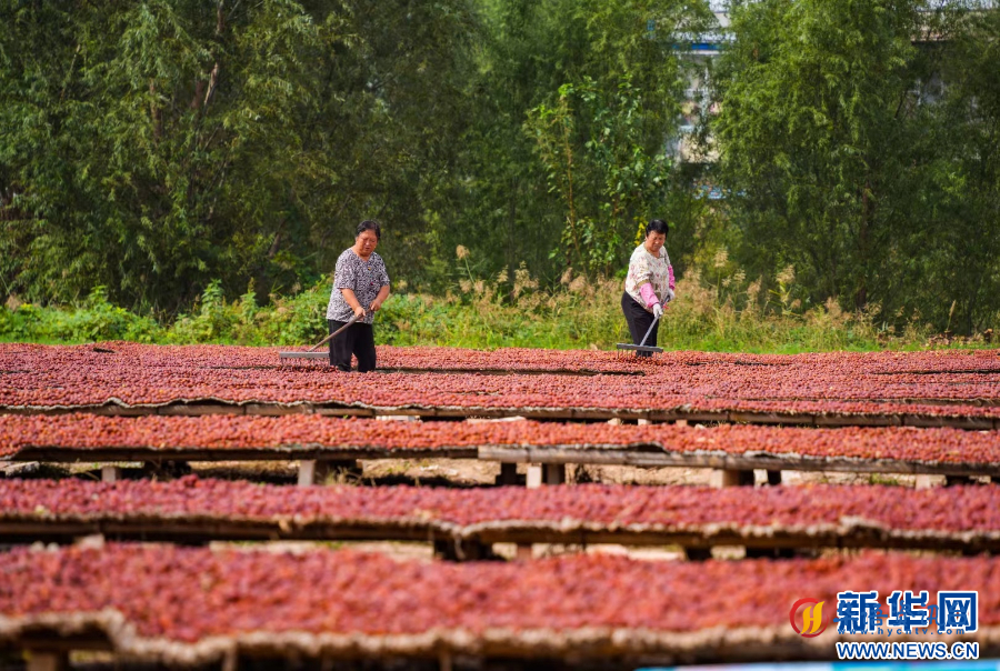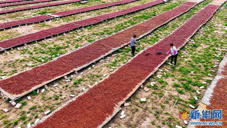 在山东省乐陵市朱集镇红枣股份合作社,枣农趁着好天气晾晒金丝小枣。新华网发(贾鹏 摄) 近日,山东省乐陵市的10万亩金丝小枣迎来了丰收季,当地枣农趁着晴好天气晾晒金丝小枣。一排排晾晒架上铺满了火红的小枣,空气中弥漫着淡淡的枣香。乐陵市以盛产金丝小枣而闻名,素有“百里枣乡”的美称,近年来,乐陵市大力实施红枣振兴工程,打造红枣种植、生产、加工、销售等环节产业融合的产业发展新高地。 枣农在翻晒金丝小枣。新华网发(贾鹏 摄) 枣农不停翻动小枣,确保小枣均匀接受阳光照射。新华网发(贾鹏 摄)