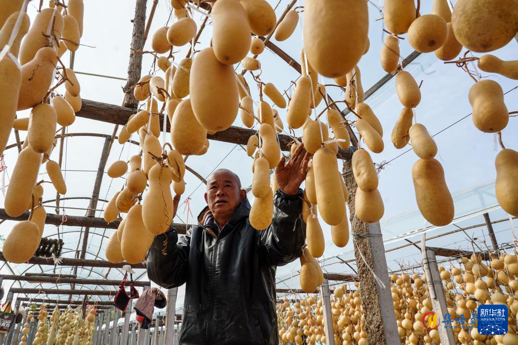 10月25日,村民傅吉虎在聊城市东昌府区堂邑镇范制葫芦种植基地内晾晒葫芦。