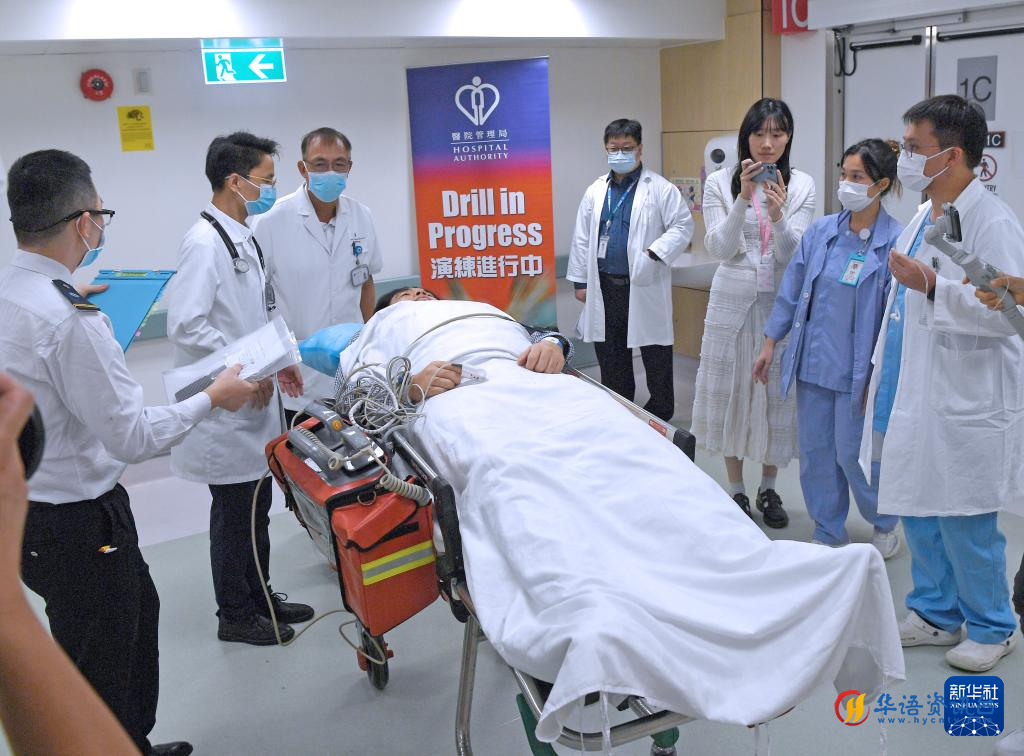 10月31日,在香港大学深圳医院,医护和急救人员运送“患者”。新华社记者 毛思倩 摄