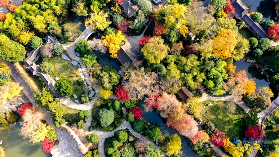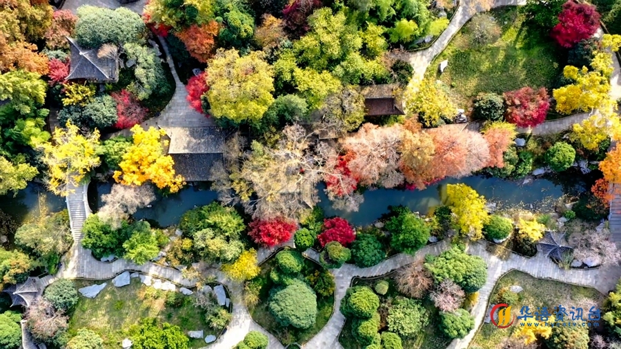深秋时节,安徽省颍上县尤家花园内的水杉、乌柏、柿树、银杏等植物色彩斑斓,满园层林尽染,处处叠翠流金,宛如一幅流动的水彩画卷。