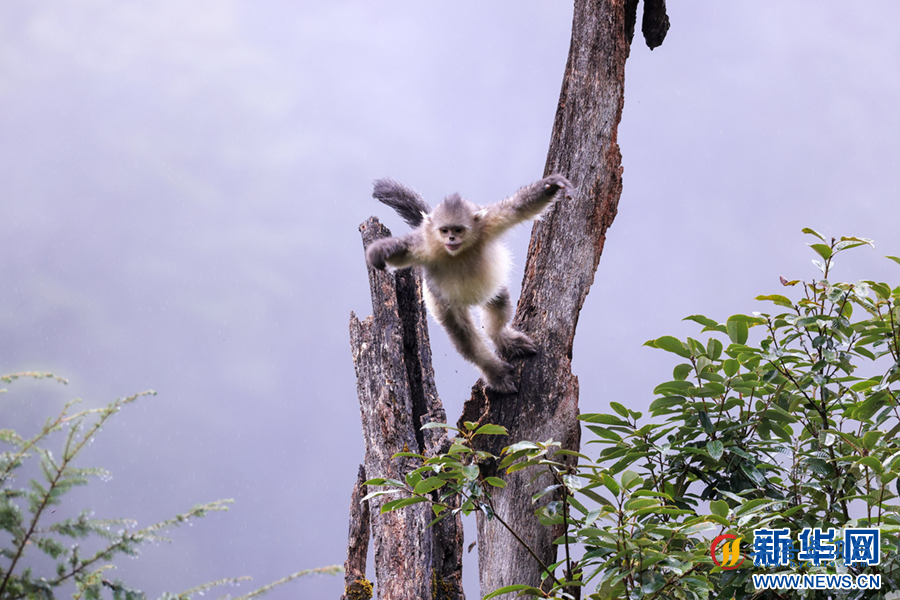 一只滇金丝猴准备从树上跳下(11月5日摄)。新华网发(孙文来 摄)