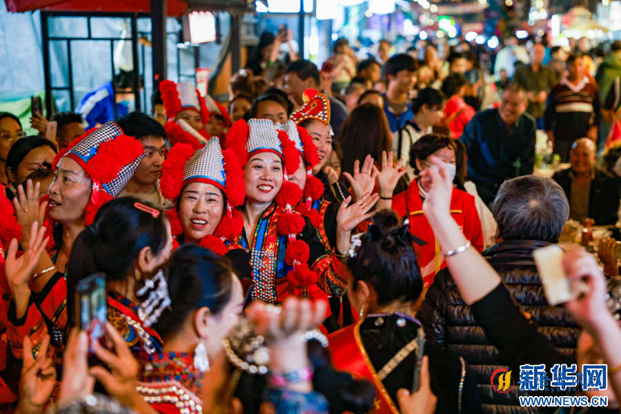 少数民族群众与游客放声欢唱(11月23日摄)。新华网发(陶家淇 摄)