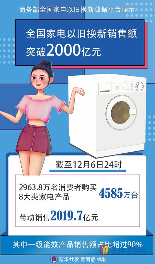新华社北京12月7日电(记者韩佳诺、谢希瑶)商务部全国家电以旧换新数据平台显示,截至12月6日24时,2963.8万名消费者购买8大类家电产品4585万台,带动销售2019.7亿元,其中一级能效产品销售额占比超过90%。