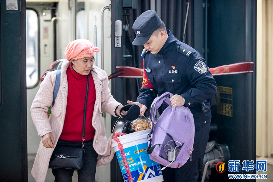 成都铁路公安局重庆公安处乘警支队民警祁悦帮助一名老年旅客提行李。新华网发(胡勇 摄)