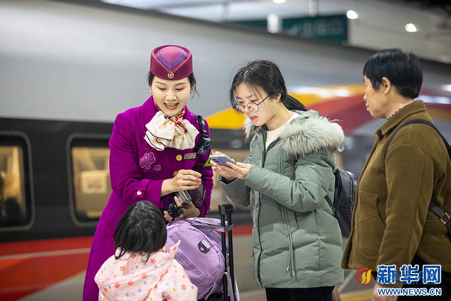 成都局集团公司重庆客运段动车四队列车长周幸回答旅客问询。新华网发(胡勇 摄)