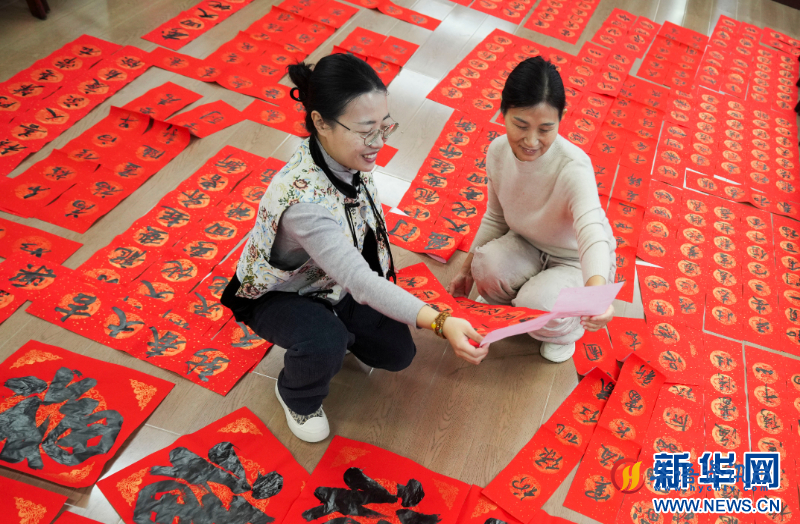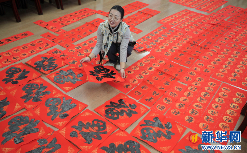 山东省邹平市西董街道段家村村民整理写好的福字和春联。新华网发(董乃德 摄)