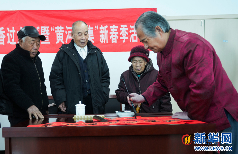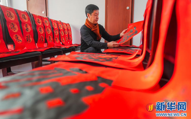 山东省邹平市书法家协会成员在西董街道段家村为村民书写春联。新华网发(董乃德 摄)