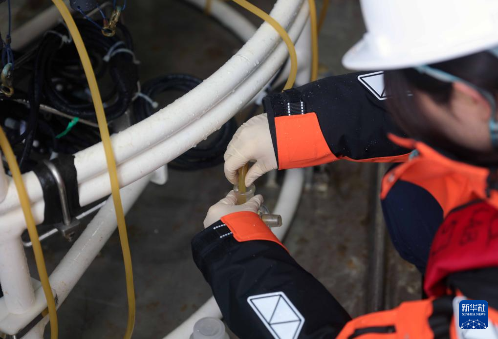 考察队员从CTD(温盐深剖面仪)中采集极地海水样本(1月18日摄)。
