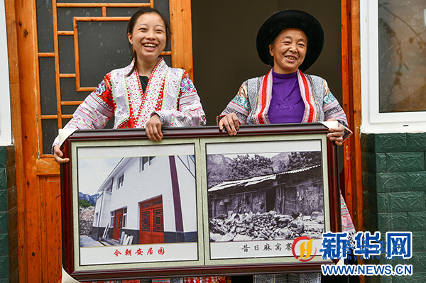 在化屋村易地搬迁安置点,苗族女孩王代玉(左)与母亲杨文梅在自家新房前展示搬迁前后的对比照片(2021年2月20日摄)。新华社记者 杨文斌 摄