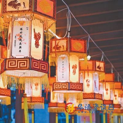 广东汕头市澄海区灯谜文化长廊内,一盏盏写有灯谜的花灯,等待游客观赏解谜。 |