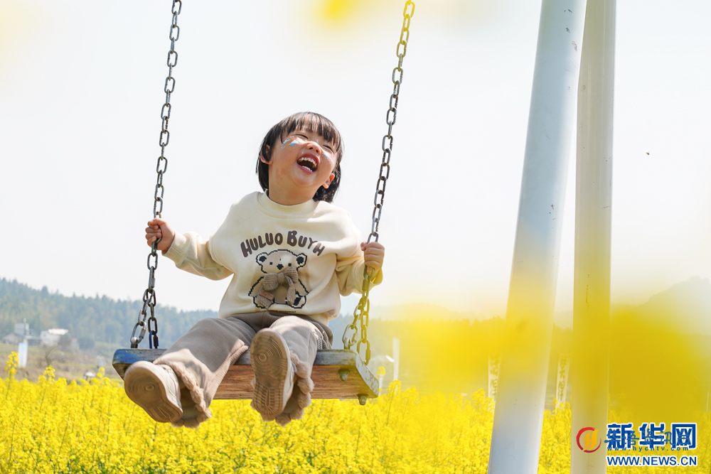 3月23日,浦城县仙阳镇“麒麟畈”万亩油菜花海,小朋友在荡秋千。
