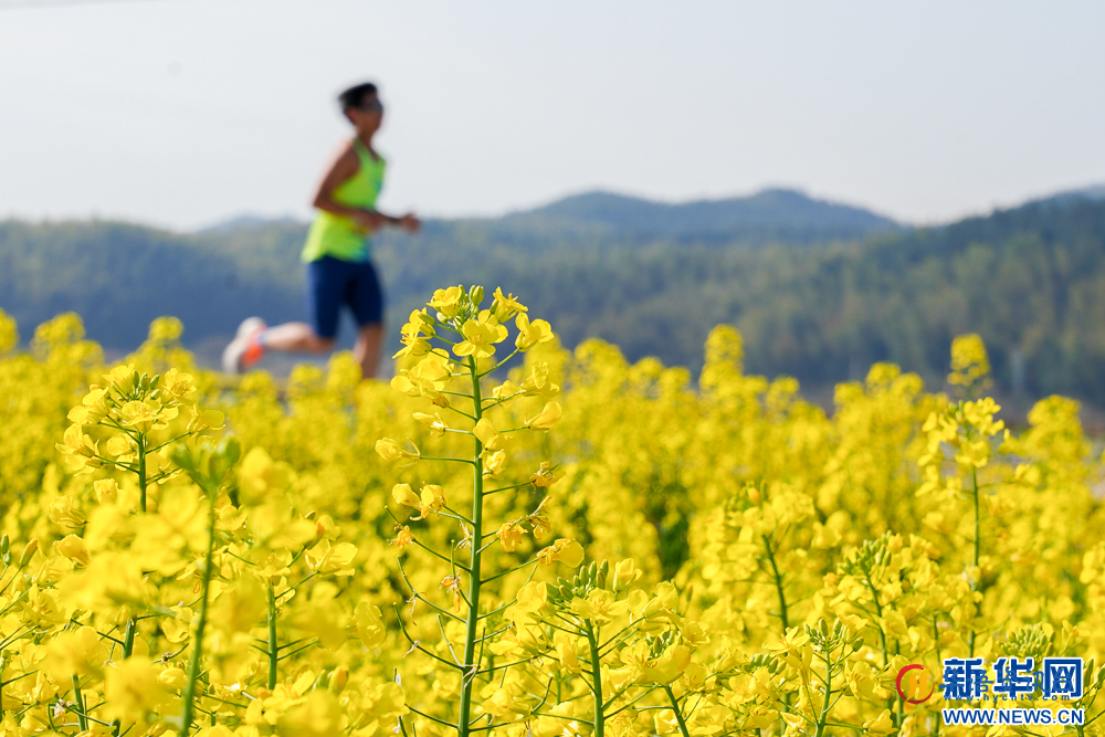 3月23日,浦城县仙阳镇“麒麟畈”万亩油菜花海,一名参加美丽乡村跑活动的跑步爱好者从花间跑过。新华网 肖和勇 摄