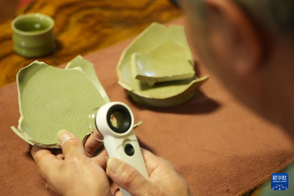 4月17日,施尚剑在位于慈溪市桥头镇的工作室查看古越窑青瓷残片。