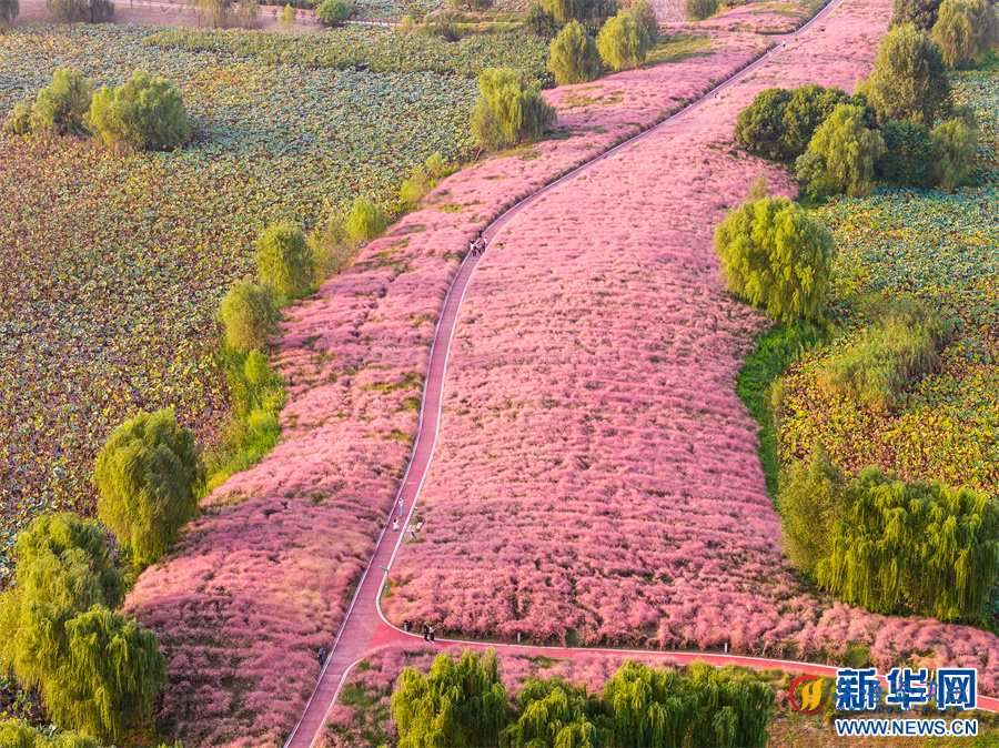 近日,安徽省池州市平天湖生态湿地内,粉黛乱子草迎来最佳观赏期。层层叠叠的粉色花海随风摇曳,尽显秋日浪漫,吸引了众多市民、游客前来打卡游玩。新华网发(饶治国 摄)