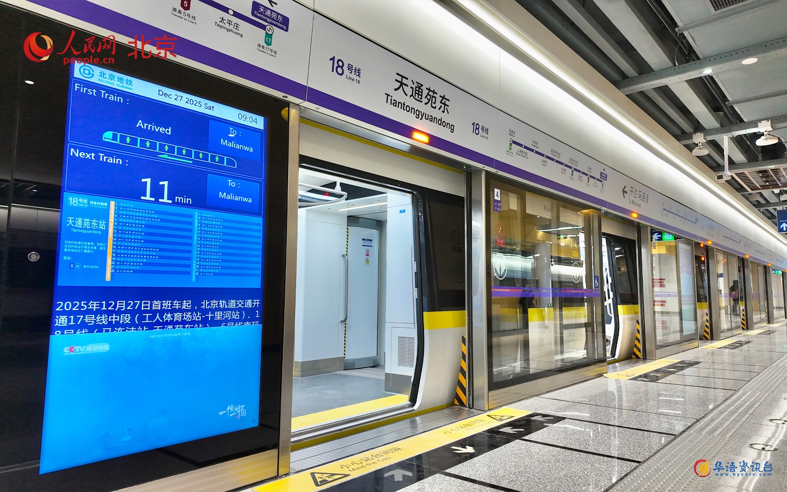 人民网北京12月27日电 (记者董兆瑞、李世奇)12月27日首班车起,北京地铁17号线中段、18号线、6号线南延等3条(段)城市轨道交通新线开通试运营,新增运营里程约30公里。至此,北京城市轨道交通运营总里程达到909公里,标志着首都轨道交通网络规模、服务能力与综合交通承载力迈上新台阶。