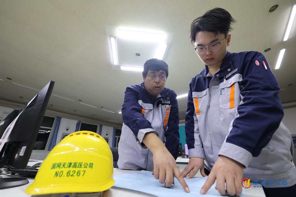 谈晨(左)、孙宇航(右)正在研究500千伏新北郊变电站建设图纸。新华社发(沈尚文摄)