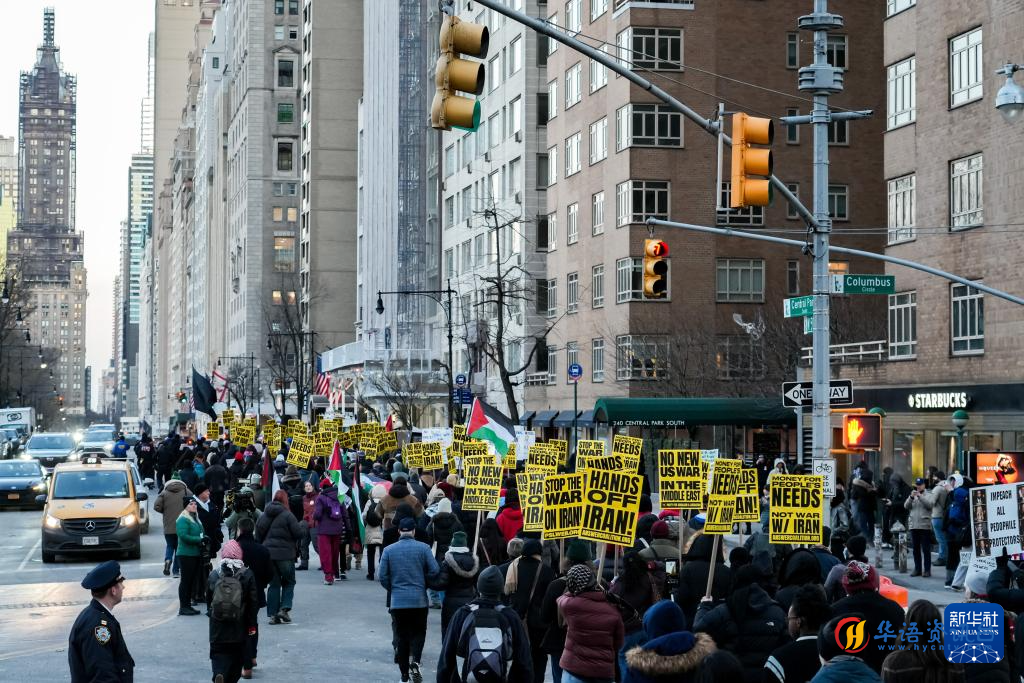 2日傍晚,数百名抗议者冒着严寒在纽约市哥伦布圆形广场集会,组织方代表发表演讲,人们手持标语,大声呼喊反战口号,要求“停止针对伊朗的战争”,随后开始游行示威。
