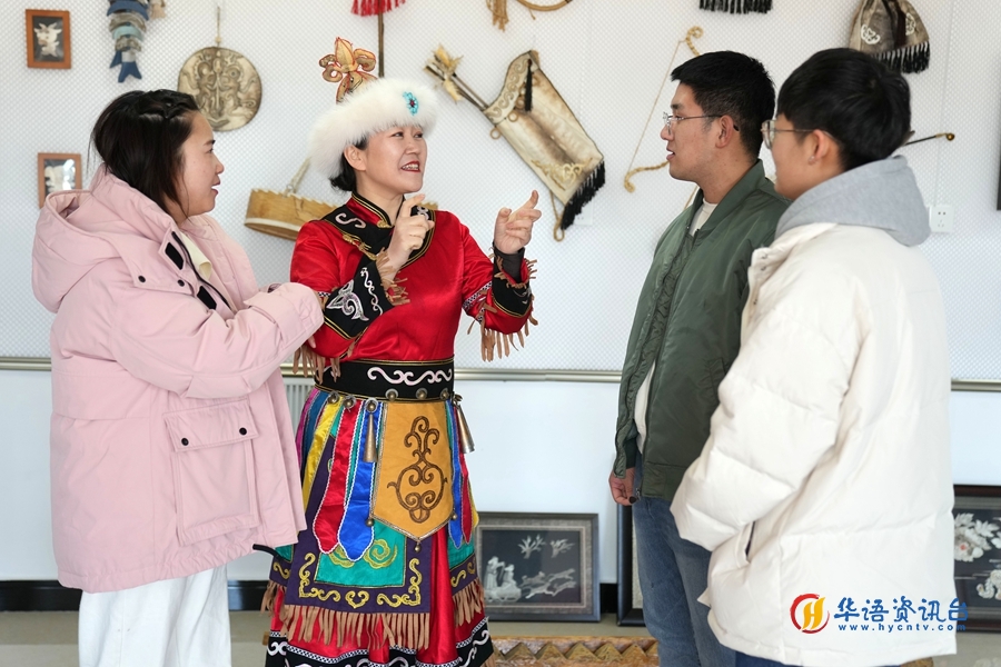 2023年2月23日,在黑龙江省同江市八岔赫哲族乡八岔村伊玛堪传习所,刘蕾(左二)与年轻人交流。新华社记者 王建威 摄