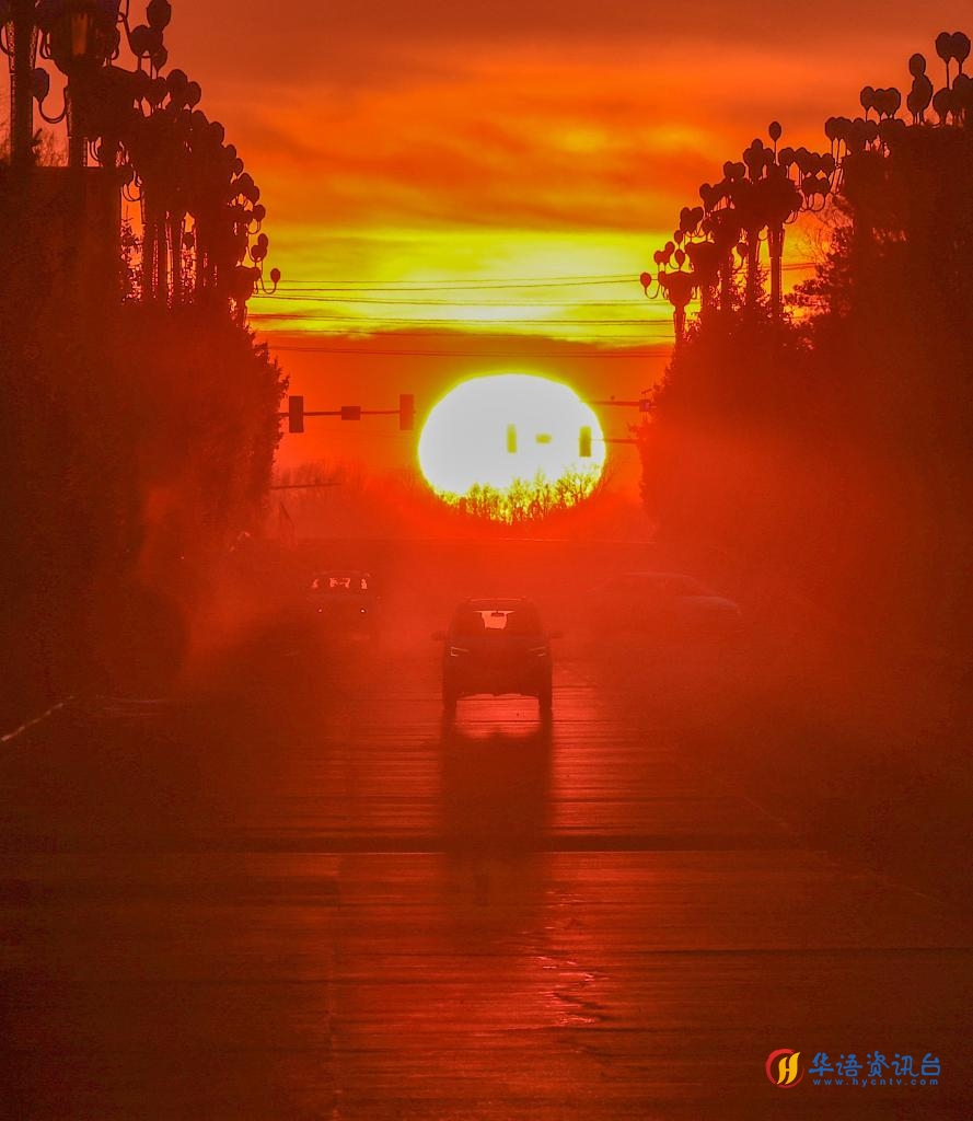 地球绕太阳公转时,太阳直射点在南北回归线之间移动,使得太阳升起和落下的方位在一年中呈周期性变化。当城市街道走向与太阳出没的方位角一致时,太阳会恰好出现在街道尽头正上方的地平线上,形成悬日景观。