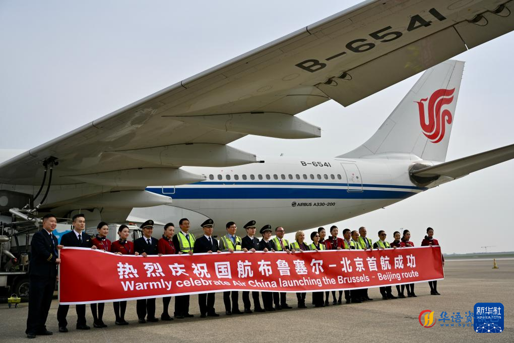3月24日,在比利时布鲁塞尔国际机场,中国国际航空公司机组人员在首航仪式上合影。新华社记者 吕优 摄