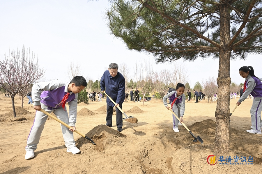 挥锹铲土、培土围堰、提水浇灌……习近平接连种下油松、北京牡丹、榆叶梅、杜仲、元宝枫等多棵树苗。他一边植树,一边询问孩子们的学习生活、劳动锻炼和参加植树情况。习近平强调,青少年像小树苗一样充满活力和希望,要从小树立远大志向,爱知识、爱劳动、爱自然,德智体美劳全面发展,努力成长为栋梁之材。现场气氛热烈,一派繁忙景象。