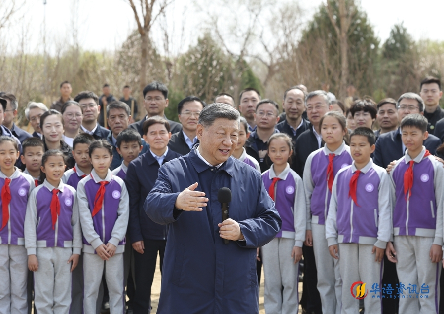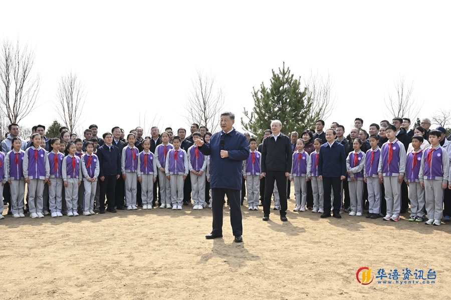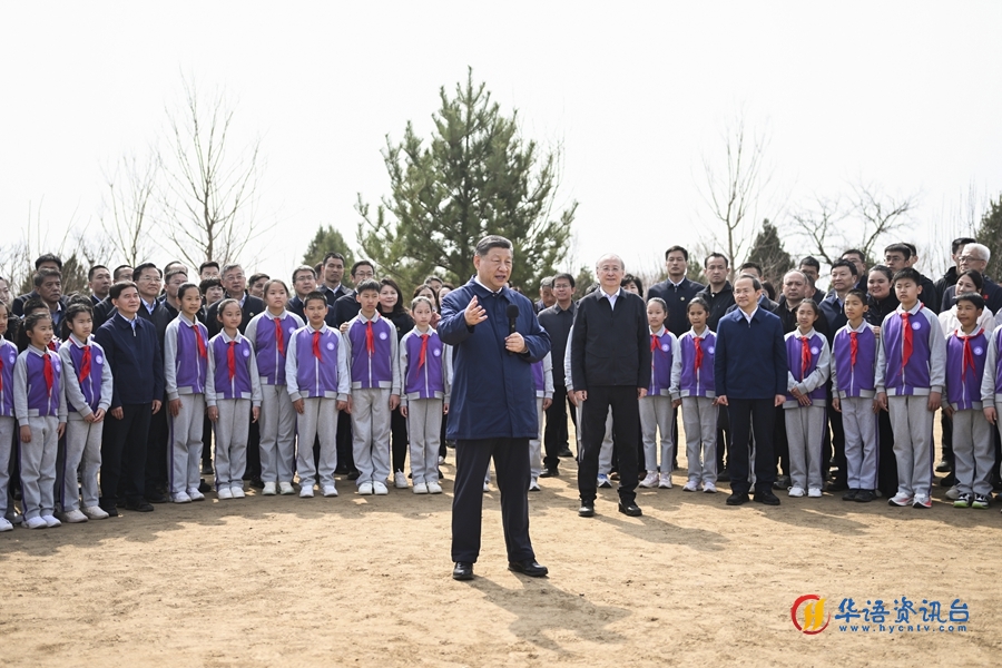 3月30日,党和国家领导人习近平、李强、赵乐际、王沪宁、蔡奇、丁薛祥、李希等来到北京市昌平区百善镇参加首都义务植树活动。这是习近平同在场的干部群众、少先队员亲切交谈。新华社记者 谢环驰 摄