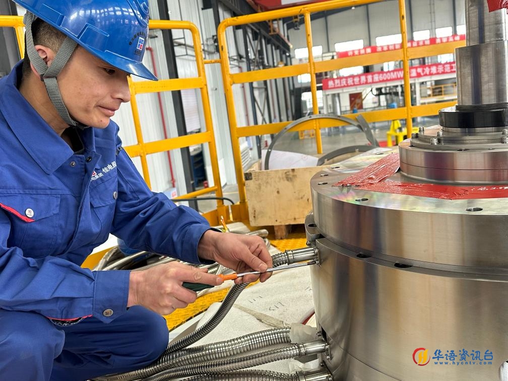 在位于黑龙江省的哈尔滨电气集团佳木斯电机股份有限公司,全国劳动模范关涛正在固定主氦风机电磁轴承转速传感器信号线。新华社记者 朱悦 摄