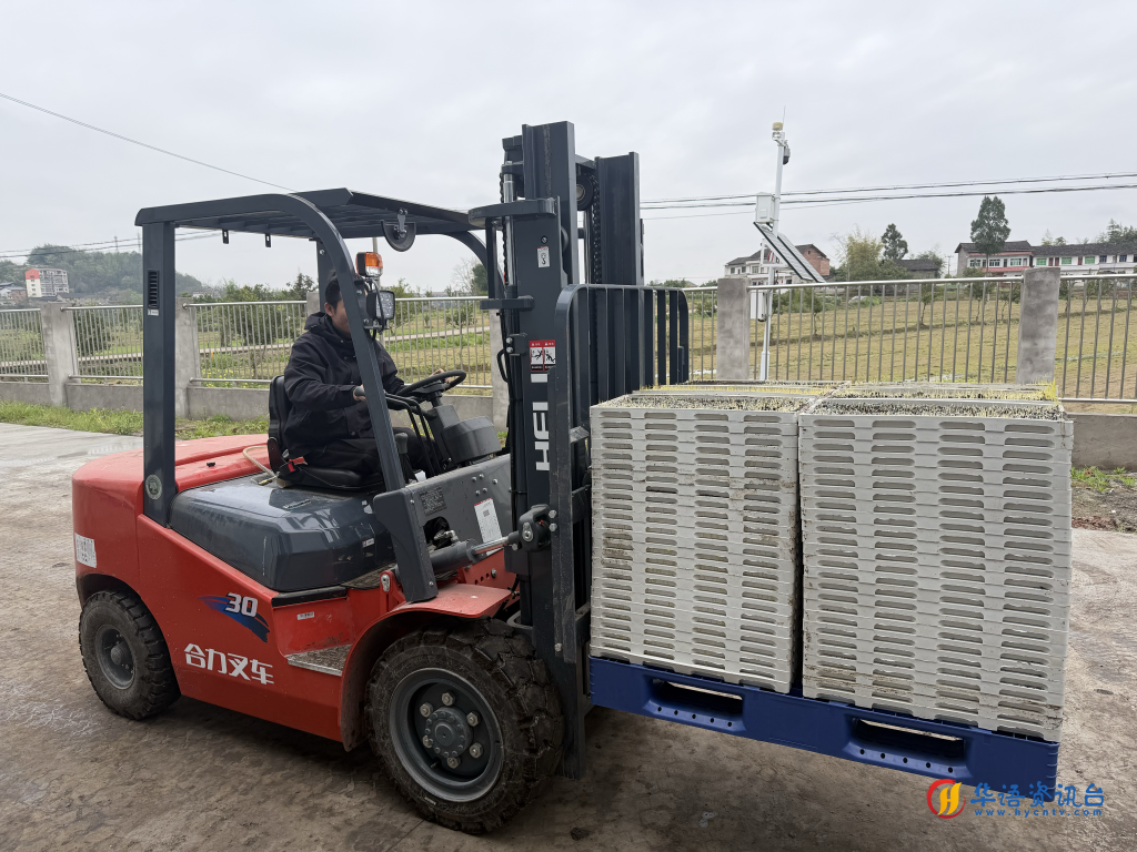 在垫江县高峰镇,工作人员正在运输出芽的秧苗。新华社记者赵佳乐 摄