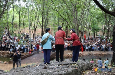 “阳山有‘桃乡’美誉,景色也很好,特别是到春天,这里的万亩桃林花开正盛,美丽景色令人流连忘返,结合此情此景,我就有了创作的想法,让人们在美景之中欣赏美文,相得益彰。”谈及创作的初衷,今年88岁的王宏才如是说。